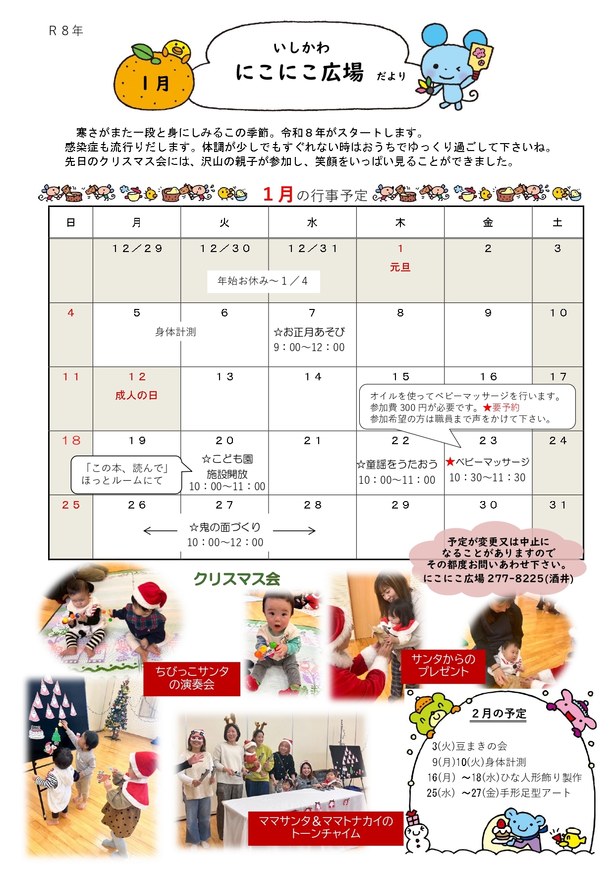0~3歳の未就園児を持つ親子が誰でも気軽に遊びに来れる場所です。子育てで辛いのは私だけじゃないんだ!とホッとできる場所です。月~金曜日午前9時~午後2時まで季節の行事・手作りおもちゃ・子育ての相談・情報交換など行っています。